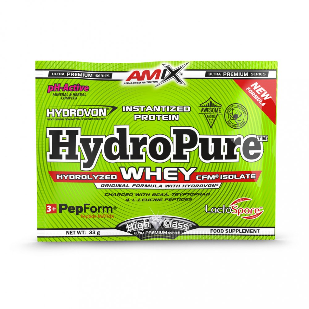 Amix HydroPure Whey Protein je špičkový protein se 100% obsahem značkové suroviny Hydrovon. Hydrovon je čistý hydrolyzovaný CFM syrovátkový izolát. Produkt je navíc obohacen o komplex peptidů PepForm, pH-Active komplexem a probiotiky LactoSpore.