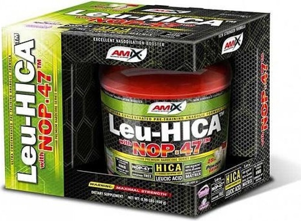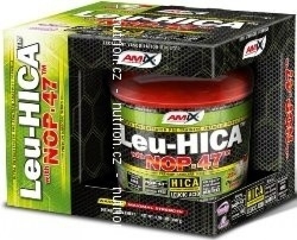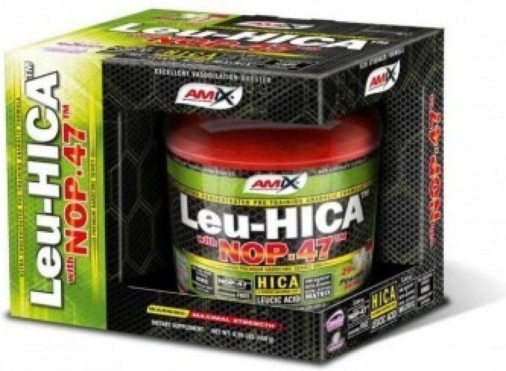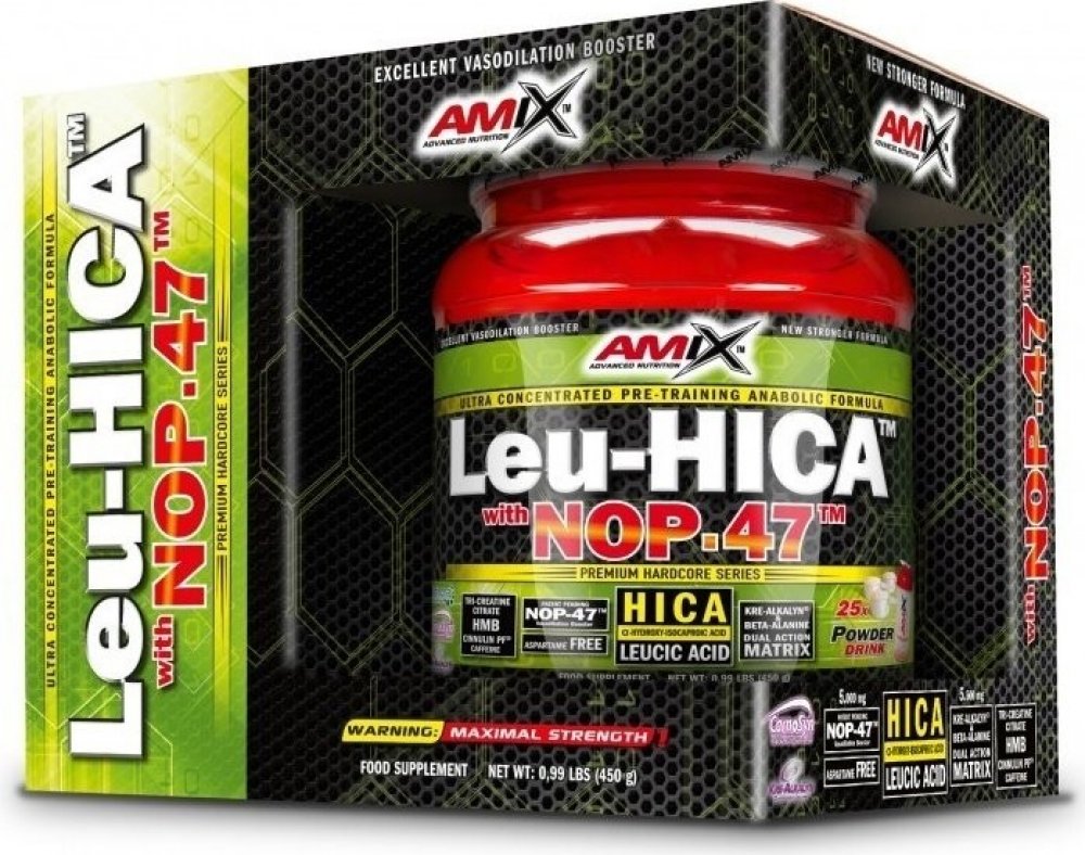 AMIX™ Amino Leu-HICA™ with NOP-47™ je unikátní a vysoce efektivní před-tréninkový přípravek založený na bázi dvou revolučnáích složek - HICA and NOP-47™. První – leucic acid, také známá jako alpha-hydroxy-isokapronová kyselina (HICA) je přírodní metabolit větvené aminokyseliny L-Leucinu. Jedna dávka poskytuje 5 gramů unikátního NOP-47™, což je speciální obohacený syrovátkový hydrolyzát s unikátním aminokyselinovým spektrem. Je výborným zdrojem kvalitních bílkovin.