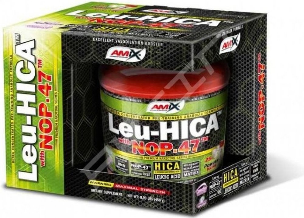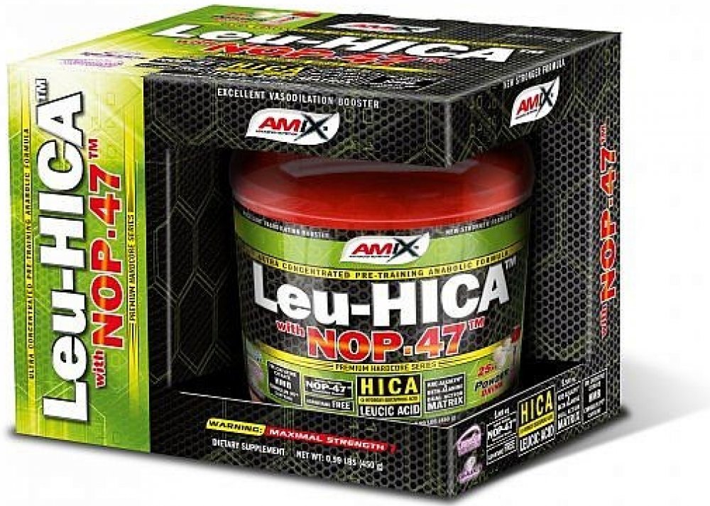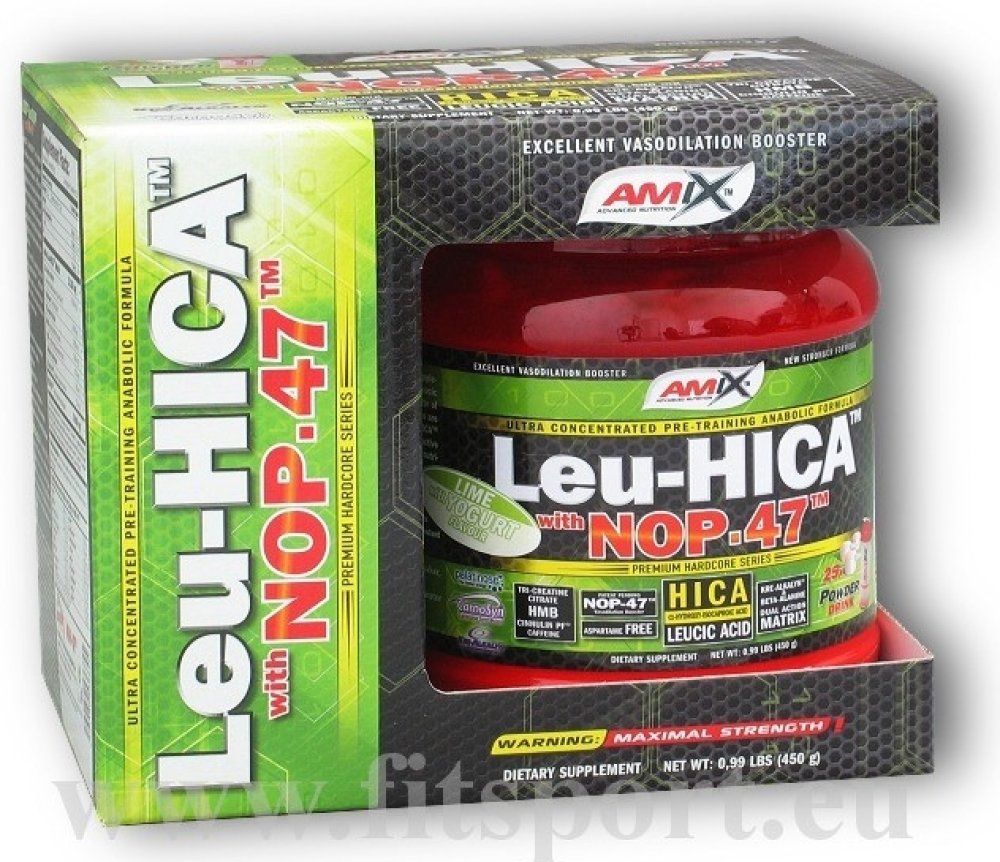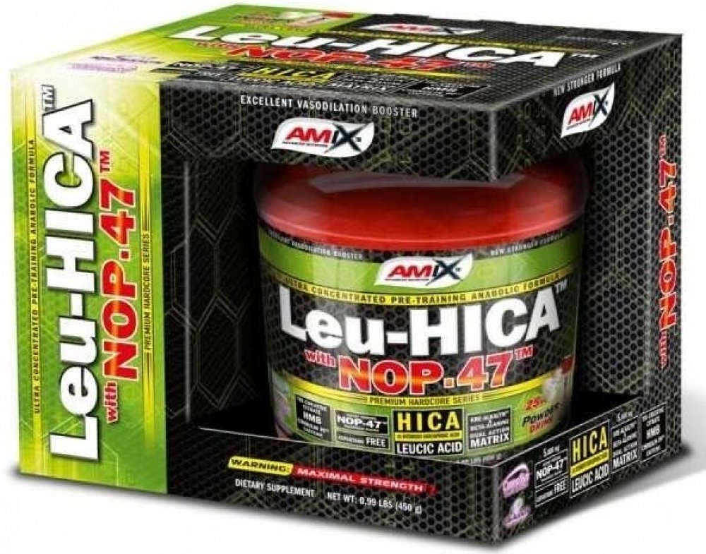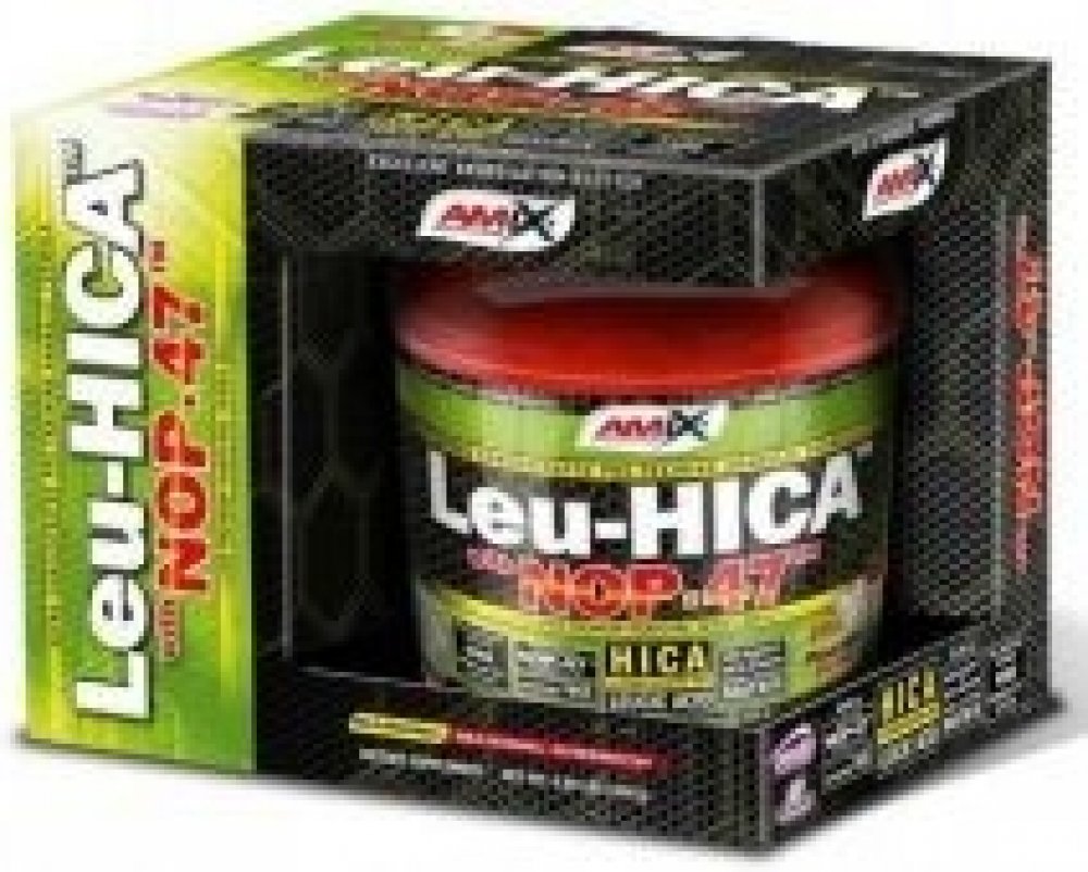 AMIX™ Amino Leu-HICA™ with NOP-47™ je unikátní a vysoce efektivní před-tréninkový přípravek založený na bázi dvou revolučnáích složek - HICA and NOP-47™. První – leucic acid, také známá jako alpha-hydroxy-isokapronová kyselina (HICA) je přírodní metabolit větvené aminokyseliny L-Leucinu. Jedna dávka poskytuje 5 gramů unikátního NOP-47™, což je speciální obohacený syrovátkový hydrolyzát s unikátním aminokyselinovým spektrem. Je výborným zdrojem kvalitních bílkovin.