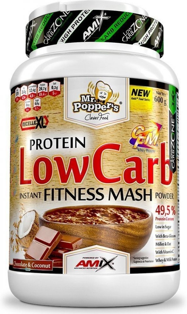 Mr. Popper ´s® Low Carb Mashje perfektní řešení pro stravu zaměřenou pro výživu sportovců. Touto kaší si můžetedoplnit kvalitní živiny během celého dne, nejlépe v doběvašeho tréninku. Obsahuje pouze kvalitní suroviny jako je CFM syrovátkový bílkovinný izolát a koncentrát s micelárním kaseinem, v kombinaci s cereáliemi bohatými na beta-glukany. Kaše je dále obohacena o vitamín C.