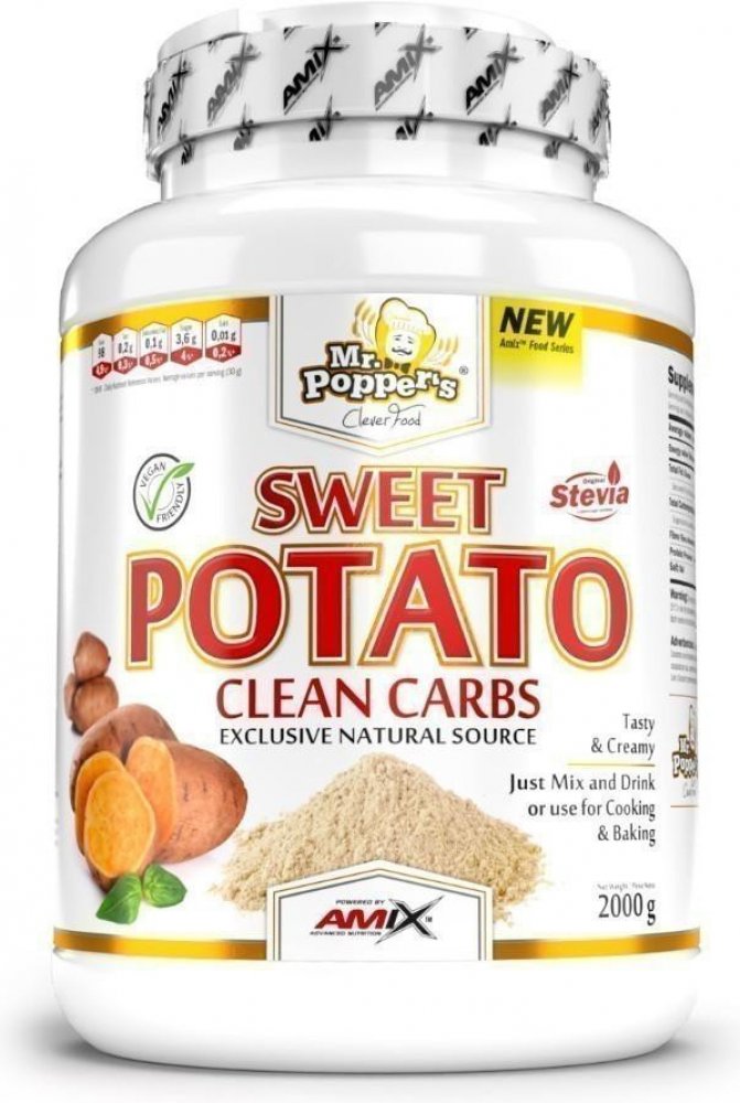 Amix Sweet Potato 1000 g Sweet Potato Clean Carbs je speciální směs na zastudena připravený nápoj z batátové mouky, která je bohatá na sacharidy, rozpustnou vlákninu a menší obsah dalších mikroživin. Benefity: Vynikající chuť a krémová struktura Rychlá příprava - stačí zamíchat a vypít Snadná příprava - za studena Vhodné jako surovina pro vaření Varianta bez příchutě je vhodná i na vaření a pečení Doporučené dávkování Smíchejte 30 g (3/4 odměrky) s 200 ml studené vody a míchejte do té doby, než dostanete krémovou konzistenci. Použijte šejkr nebo ruční šlehač. Ihned konzumujte. Může být také použito na pečení. Nutriční informace 30 g Bez příchutě 100 g Bez příchutě 30 g Varianta s příchutí 100 g Varianta s příchutí Energetická hodnota 425 kJ/100 kcal 1416 kJ/ 335 kcal 414 kJ/98 kcal 1380 kJ/326 kcal Tuky 0,2 g 0,8 g 0,2 g 0,8 g - z toho nasycené mastné kyseliny 0,1 g 0,3 g 0,1 g 0,3 g Sacharidy 21,6 g 72,0 g 21,0 g 70,2 g - z toho cukry 3,7 g 12,5 g 3,6 g 12,2 g Vláknina 4,2 g 14,0 g 4,0 g 13,6 g Bílkoviny 0,9 g 3,0 g 0,9 g 2,9 g Sůl 0 g 0 g 0,01 g 0,01 g Složení Bez příchutě: batátová mouka 100%. S příchutí: batátová mouka 98%, kakaový prášek (pouze pro příchuť čokoláda), aroma, sladidla: steviol glykosidy, sukralóza a acesulfam K; chlorid sodný. Informace Směs na přípravu nápoje. Nevhodné pro děti do 3 let. Skladujte v suchu při teplotě do 25 °C, chraňte před přímým slunečním zářením a před mrazem. Výrobce neručí za škody vzniklé nevhodným použitím nebo skladováním. Výrobce: LargeLife Ltd., Bexley square 6, M36BZ Salford Manchester, United Kingdom