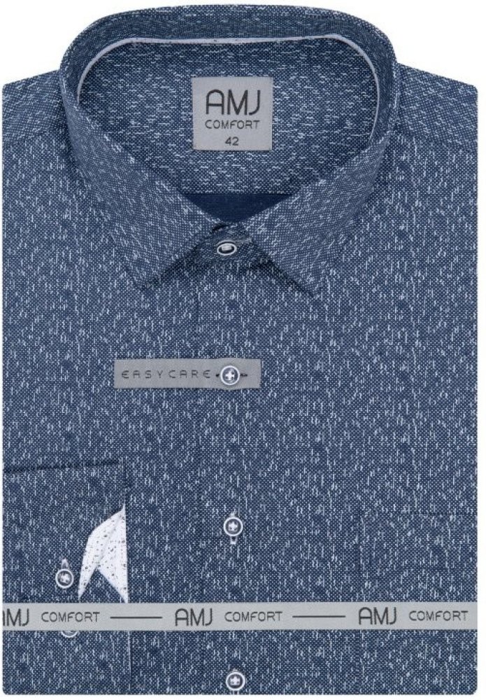 Košile s dlouhým rukávem od značky AMJ v tmavě modré barvě s jemnými bílými puntíky a přerušovanými pruhy. Zapínání na knoflíky v bílé a modré kombinaci. Košile má jednu kapsičku na hrudi. Ušita z příjemného a pohodlného materiálu z 95 % bavlny a 5 % spandexu. Má jednu kapsičku. Košile v úpravě EASY CARE, která zajistí snadné žehlení.