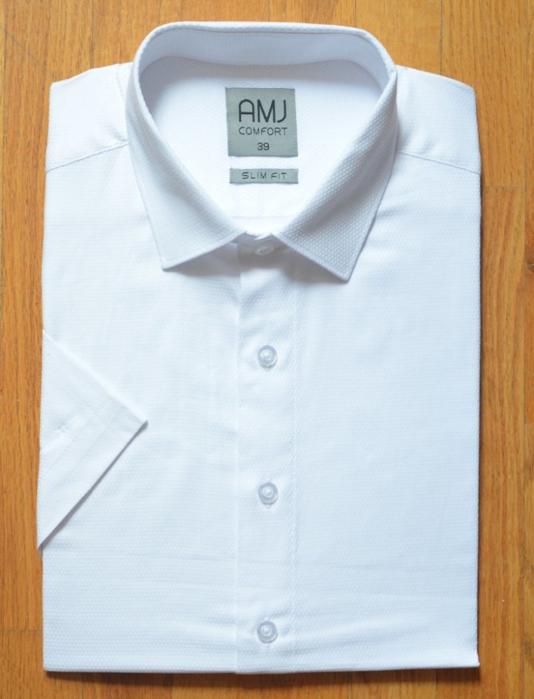 Košile s krátkým rukávem od značky AMJ v bílé barvě se vzorem v barvě košile. Zapínání na světlé knoflíky. Má klasický rovný střih. Ušita z příjemného materiálu z 95 % bavlny a 5 % spandexu. Košile v úpravě EASY CARE, která zajistí snadné žehlení.