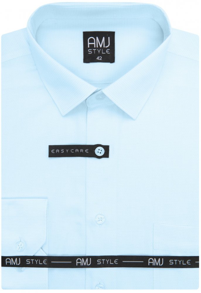 Košile s dlouhým rukávem od značky AMJ ve světle modré barvě s jemnou strukturou. Zapínání na černé knoflíky. Má klasický rovný střih a kapsičku na levé straně hrudi. Ušita z 60 % bavlny a 40 % polyesteru.
