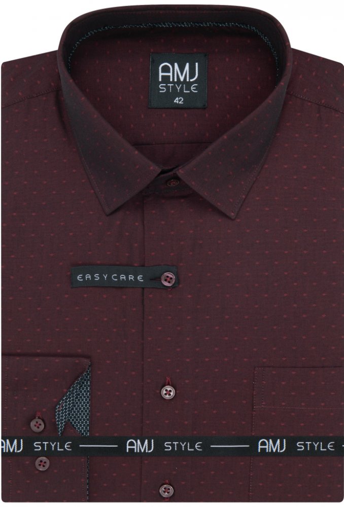 Košile s dlouhým rukávem od značky AMJ ve vínové barvě s jemnou tmavou nitkou. Košile v tmavě vínové barvě s jemným světlejším vzorečkem. Má kapsičku na levé straně hrudi. Zapínání na vínové knoflíky. Ušita z 60 % bavlny a 40 % polyesteru. Košile v úpravě EASY CARE, která zajistí snadné žehlení. Zapínání rukávů na klasický knoflík.