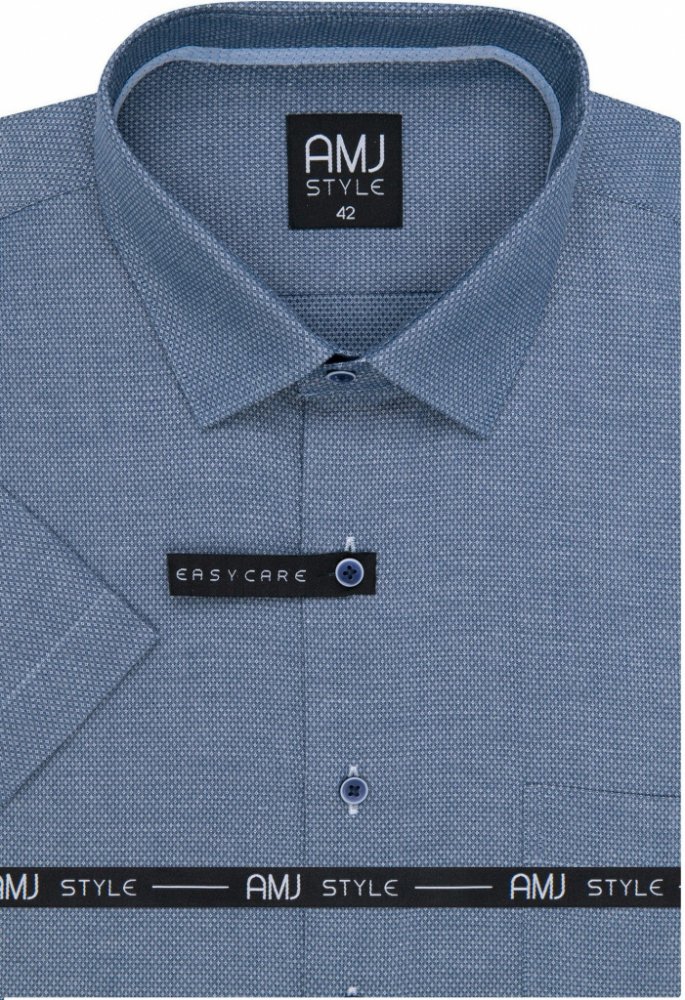 Košile s krátkým rukávem od značky AMJ v modré barvě s velmi jemným vzorem. Zapínání na modré knoflíky se světlým ohraničením. Má klasický rovný střih. Ušita z příjemného materiálu z 60 % bavlny a 40 % polyesteru. Košile v úpravě EASY CARE, která zajistí snadné žehlení.