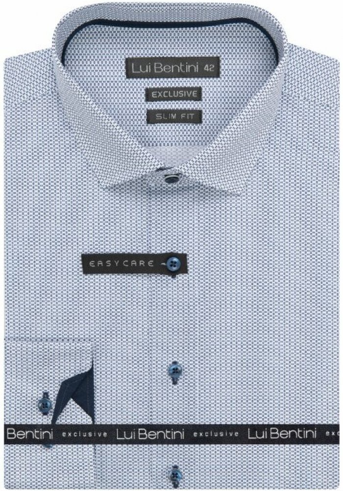 Společenská košile s dlouhým rukávem od značky AMJ v prvotřídní kolekci Lui Bentini. Košile v bílé barvě s modrým vzorečkem. Ušita v užším střihu SLIM FIT. Zapínání na modré knoflíky. Košile bez kapsičky. Ušita z 97 % bavlny a 3 % spandexu v úpravě EASY CARE.