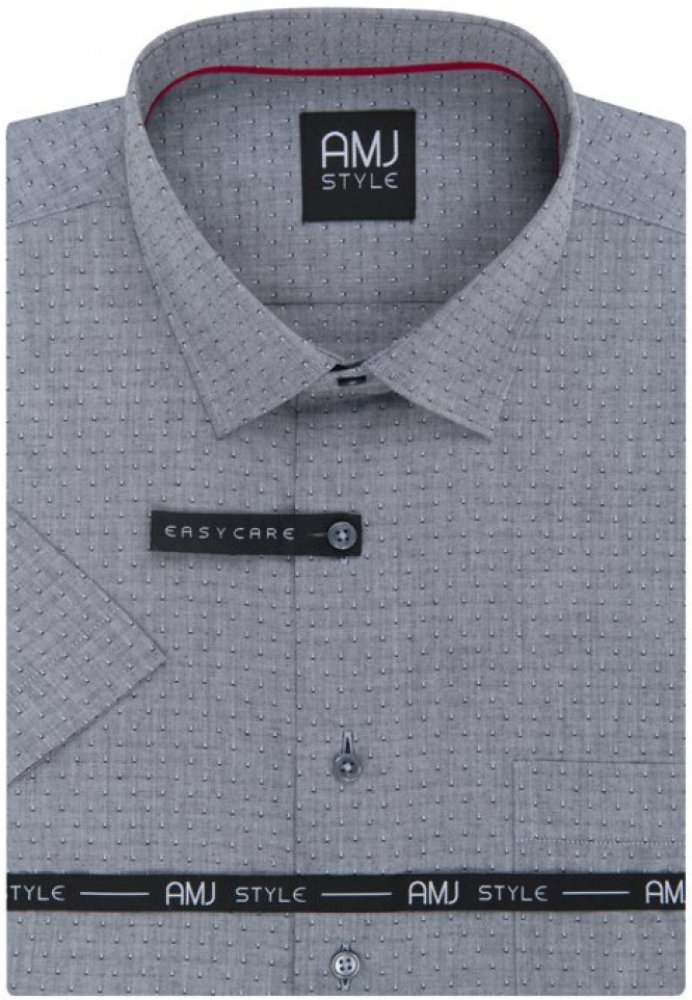 Košile s krátkým rukávem od značky AMJ v šedé barvě se světlým vzorečkem. Zapínání na knoflíky. Košile s propracovanými detaily. Vnitřek límce má odlišnou látku v červeném provedení. Má klasický rovný střih. Ušita z příjemného materiálu z 60 % bavlny a 40 % polyesteru. Košile v úpravě EASY CARE, která zajistí snadné žehlení.