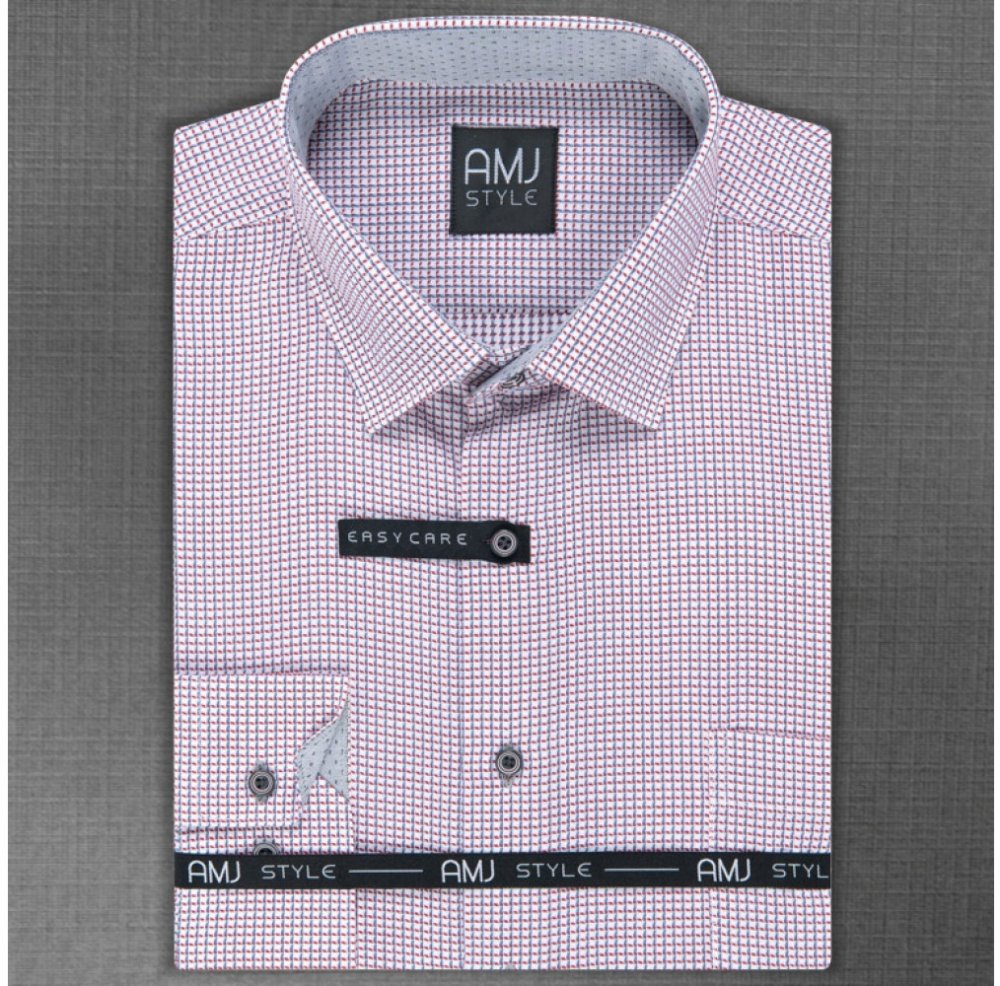 Košile s dlouhým rukávem od značky AMJ v bílé barvě se vzorem v červené a modré barvě. Zapínání na barevné knoflíky. Má klasický rovný střih. Má 60 % bavlny a 40 % polyesteru. Košile v úpravě EASY CARE, která zajistí snadné žehlení. Zapínání rukávů na klasický knoflík.