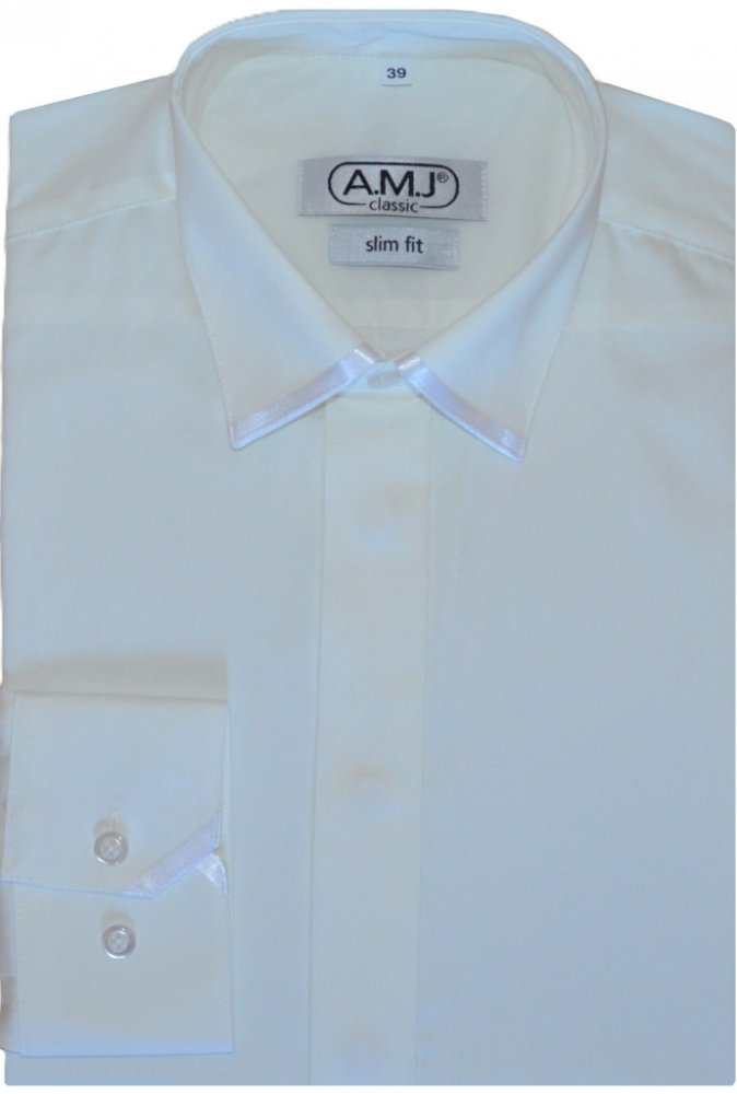 Společenská košile s dlouhým rukávem AMJ v zúženém střihu. Košile ve světle krémové barvě bez vzoru. Košile slavnostnějšího stylu. Na límečku a na rukávu je ozdobný saténový pruh. Má zakrytou légu. Rukávy se zapínáním na knoflík. Ušita z 60 % bavlny a 40 % polyesteru.