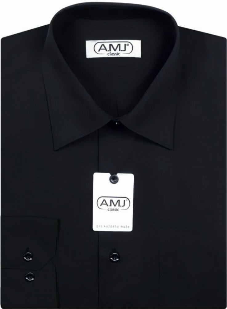 Společenská košile s dlouhým rukávem v prodloužené délce AMJ v užším střihu Slim fit. Košile v černé barvě bez vzoru. Bez kapsičky. Zapínání na černé knoflíky. Ušita z 60 % bavlny a 40 % polyesteru. Zapínání rukávů na klasický knoflík.