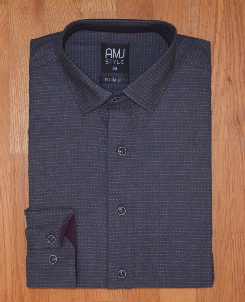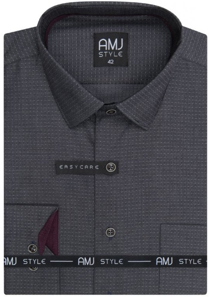 Košile s dlouhým rukávem od značky AMJ v tmavě šedé barvě s jemným vzorečkem. Zapínání na tmavé knoflíky s bílým ohraničením. Košile bez kapsičky. Má projmutý střih SLIM FIT. Vnitřek límce v tmavě modrém provedení. Má 60 % bavlny a 40 % polyester. Košile v úpravě EASY CARE, která zajistí snadné žehlení. Zapínání rukávů na klasický knoflík.