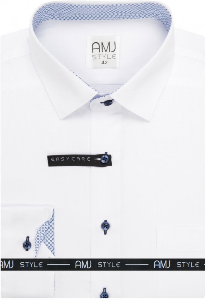 Košile s dlouhým rukávem od značky AMJ v bílé barvě s jemnou strukturou v barvě košile. Zapínání na modré knoflíky. Má kapsičku na levé straně hrudi a klasický rovný střih. Vnitřek límce a manžety v bílé barvě s jemnými modrými puntíky. Má 60 % bavlny a 40 % polyester. Košile v úpravě EASY CARE, která zajistí snadné žehlení. Zapínání rukávů na klasický knoflík.