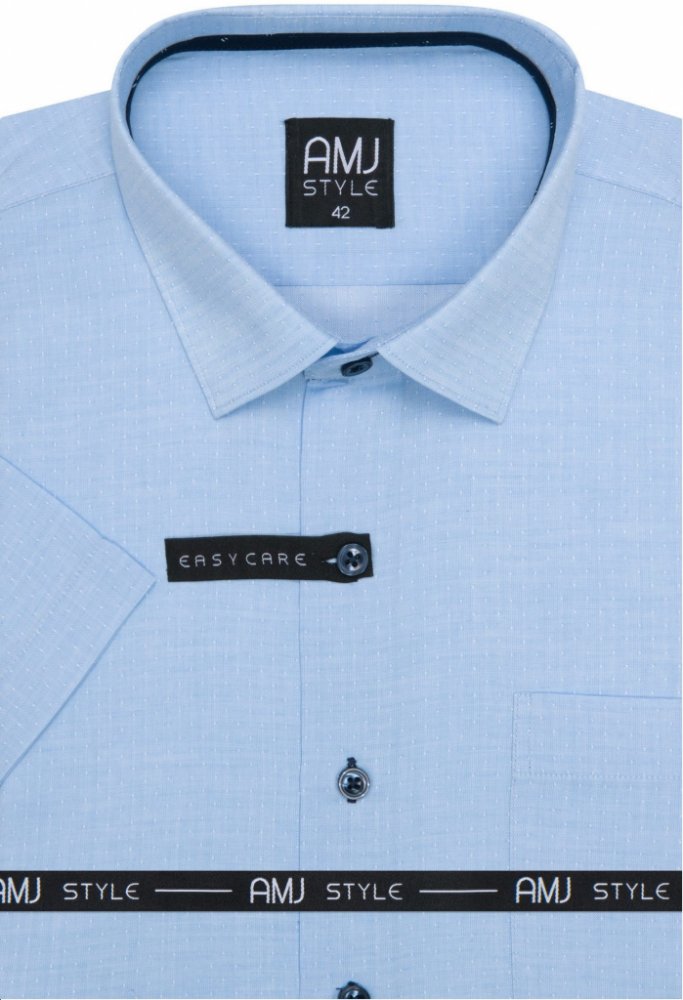 Košile s krátkým rukávem od značky AMJ ve světle modré modré se světlým vzorem ve formě malých teček. Zapínání na modré knoflíky. Má užší projmutý střih Slim Fit. Ušita z příjemného materiálu z 60 % bavlny a 40 % polyesteru. Košile v úpravě EASY CARE, která zajistí snadné žehlení.
