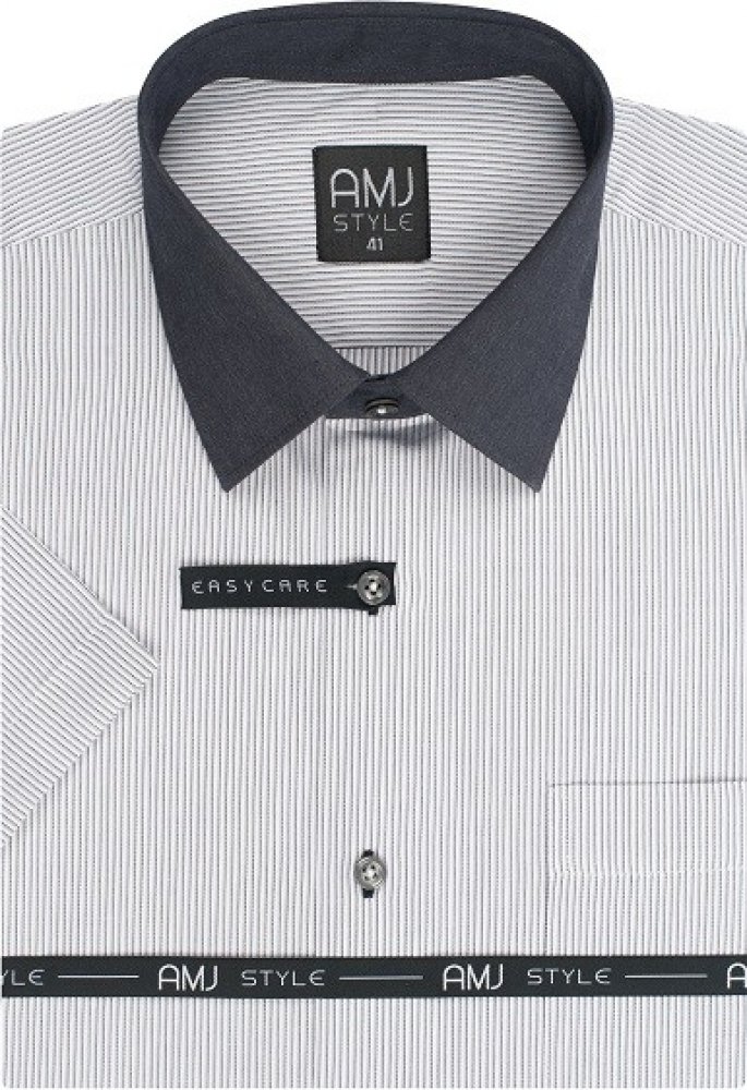Košile s krátkým rukávem od značky AMJ v bílé a šedé barvě s jemným pruhovaným vzorem. Košile s barevnými detaily. Vnější část límce v tmavě šedé barvě, která dodají šmrnc. Zapínání na šedé knoflíky. Má užší projmutý střih. Ušita z příjemného materiálu z 60 % bavlny a 40 % polyesteru. Košile v úpravě EASY CARE, která zajistí snadné žehlení.