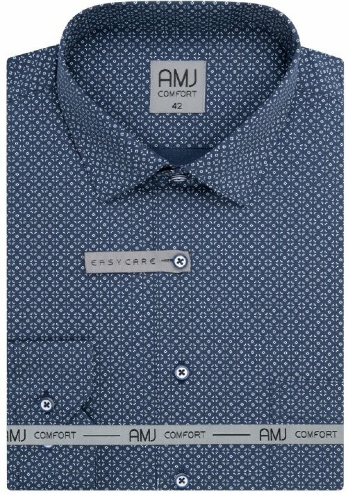 Košile s dlouhým rukávem od značky AMJ v modré barvě se světlým vzorem. Zapínání na knoflíky v bílé barvě s modrým ohraničením. Košile bez kapsičky. Má vyštíhlený střih SLIM FIT. Ušita z 95 % bavlny a 5 % spandexu. Košile v úpravě EASY CARE, která zajistí snadné žehlení.