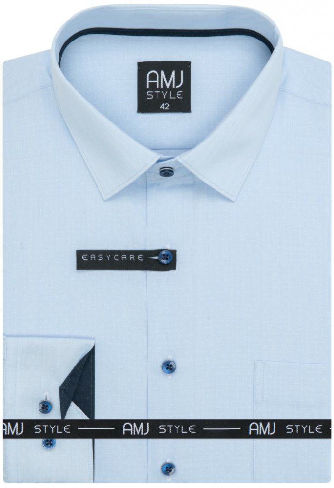 Košile s dlouhým rukávem od značky AMJ ve světle modré barvě s jemným světlým vzorečkem. Zapínání na modré knoflíky. Košile bez kapsičky. Má projmutý střih SLIM FIT. Má 60 % bavlny a 40 % polyester. Košile v úpravě EASY CARE, která zajistí snadné žehlení. Zapínání rukávů na klasický knoflík.