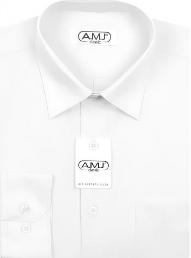 Košile s dlouhým rukávem od značky AMJ v bílé barvě bez vzoru. Košile bez kapsičky. Zapínání na světlé knoflíčky čtvercového tvaru. Má projmutý střih Slim Fit. Vyrobená z 60 % bavlny a 40 % polyesteru.