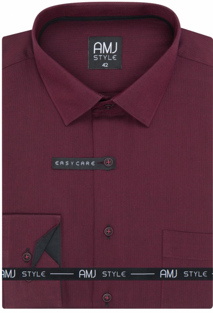 Košile s dlouhým rukávem od značky AMJ ve vínové barvě s jemnou tmavou nitkou. Zapínání na tmavé knoflíky s červeným ohraničením. Má užší projmutý střih. Ušita z 60 % bavlny a 40 % polyesteru. Košile v úpravě EASY CARE, která zajistí snadné žehlení. Zapínání rukávů na klasický knoflík.