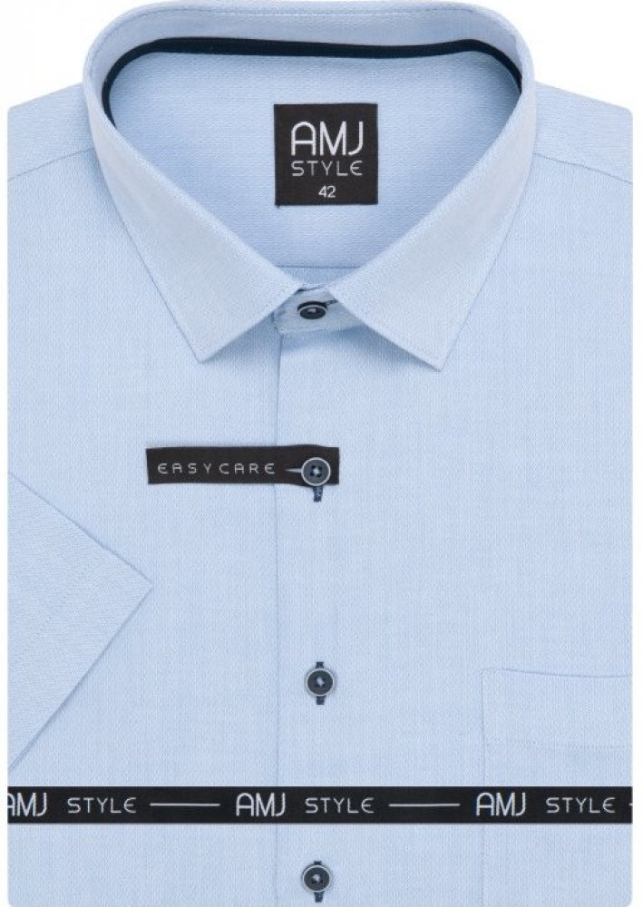 Košile s krátkým rukávem od značky AMJ ve světle modré modré s jemným vzorečkem. Zapínání na modré knoflíky. Má užší projmutý střih Slim Fit. Ušita z příjemného materiálu z 60 % bavlny a 40 % polyesteru. Košile v úpravě EASY CARE, která zajistí snadné žehlení.