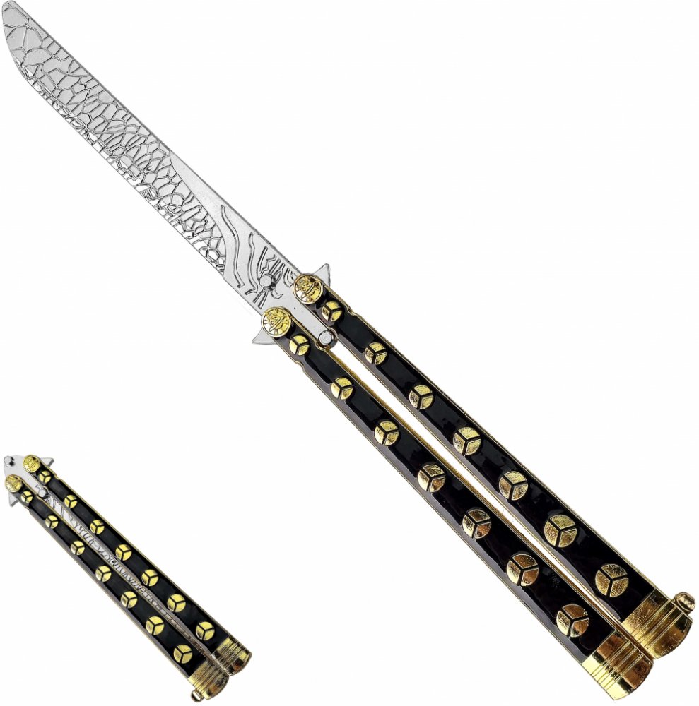 Exkluzivní tréninkový balisong inspirovaný legendární katanou Shusui, jedním ze tří nejsilnějších mečů Roronoa Zora z anime One Piece. Luxusní černozlatý design s tradičními japonskými vzory na rukojeti připomíná vzhled šógunských zbraní – a díky efektní gravírované čepeli s mořským motivem působí jako čepel z Wano Country.