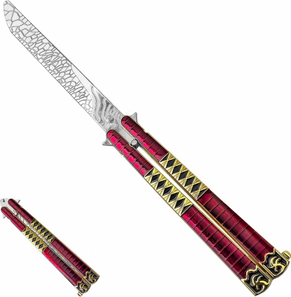 Exkluzivní tréninkový balisong inspirovaný legendární katanou Sandai Kitetsu, jedním ze tří nejsilnějších mečů Roronoa Zora z anime One Piece. Luxusní červenozlatý design s tradičními japonskými vzory na rukojeti připomíná vzhled šógunských zbraní – a díky efektní gravírované čepeli s mořským motivem působí jako čepel z Wano Country.