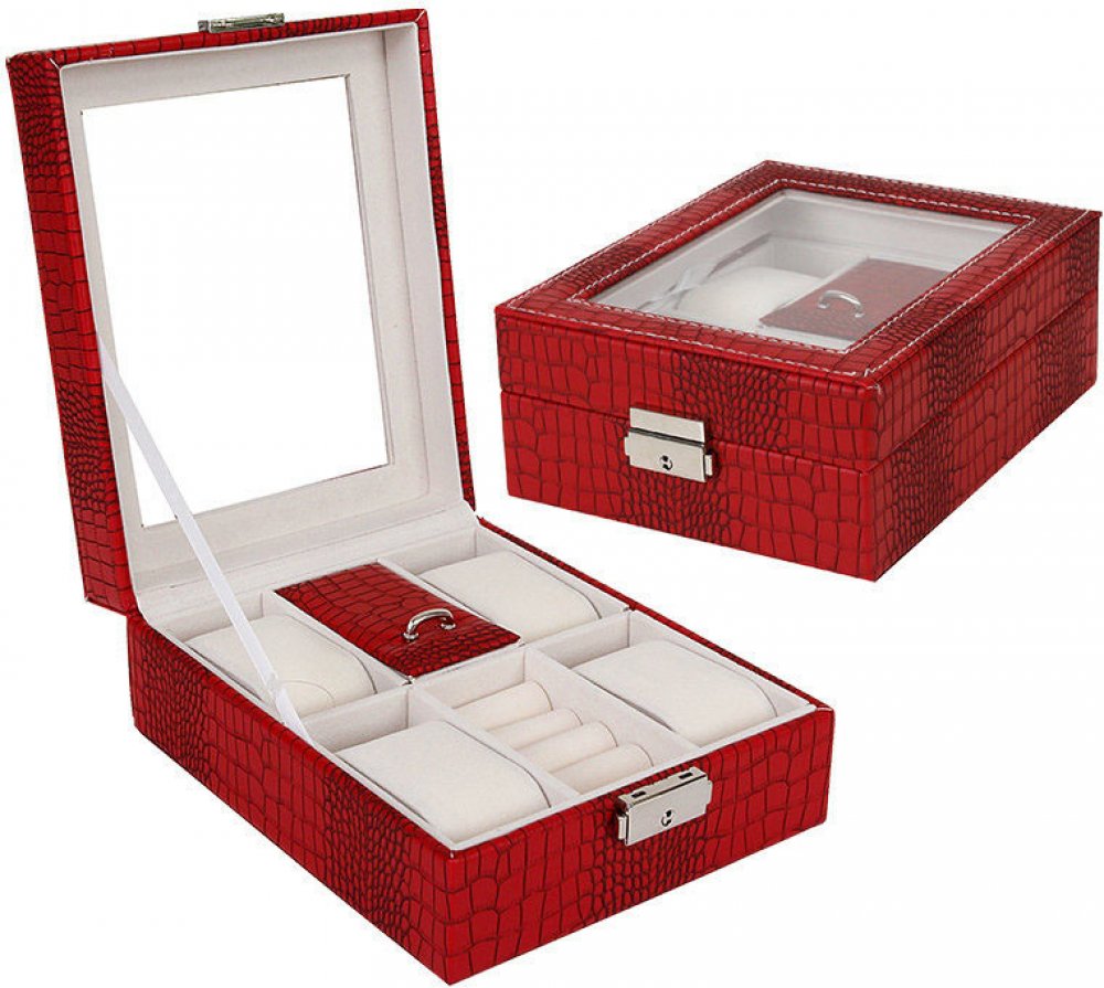 Kazeta na 4 ks náramkových hodinek nebo náramků, ve střední části jsou sloty pro uložení prstenů, manžetových knoflíčků nebo náušnic, v zadní části je prostor pro další drobné šperky. Víko kazety je uzamykatelné a prosklené. Povrch je zhotoven ze syntetické kůže, uvnitř je jemný velvet.