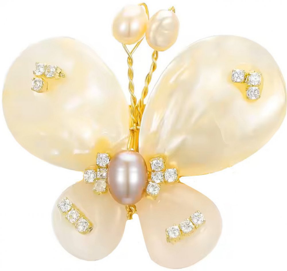 Pozlacená brož ve tvaru motýlka se zirkony a umělými perlami. Krásně doplní a oživí vaše šaty nebo sako.