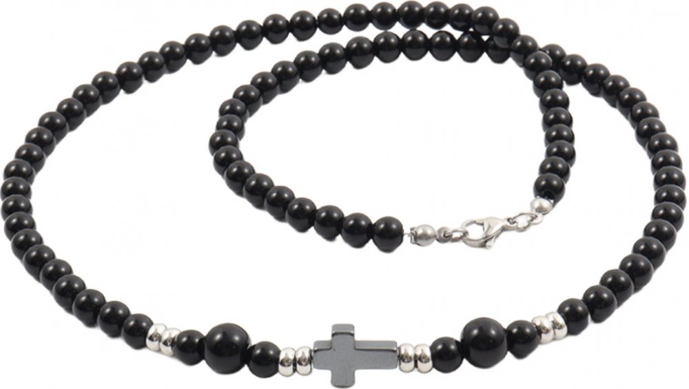 Náhrdelník s křížkem, zhotovený z kamenných perel v kombinaci 6 mm a 8 mm v délce 55 cm.