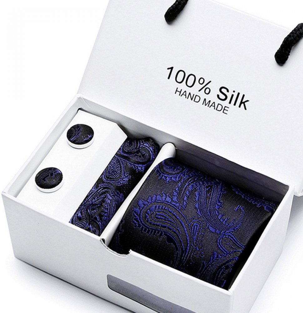 Elegantní pánská souprava obsahuje kravatu, kapesníček a manžetové knoflíčky, vše ve stejném barevném i materiálovém provedení. Kravata je velmi příjemná na dotek, dělá dobrý dojem. Manžetové knoflíčky se nosí ke košilím, které mají zesílené lemy rukávů.