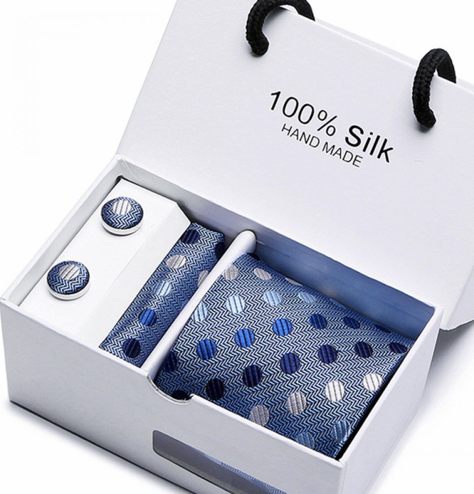 Elegantní pánská souprava obsahuje kravatu, kapesníček a manžetové knoflíčky, vše ve stejném barevném i materiálovém provedení. Kravata je velmi příjemná na dotek, dělá dobrý dojem. Manžetové knoflíčky se nosí ke košilím, které mají zesílené lemy rukávů.