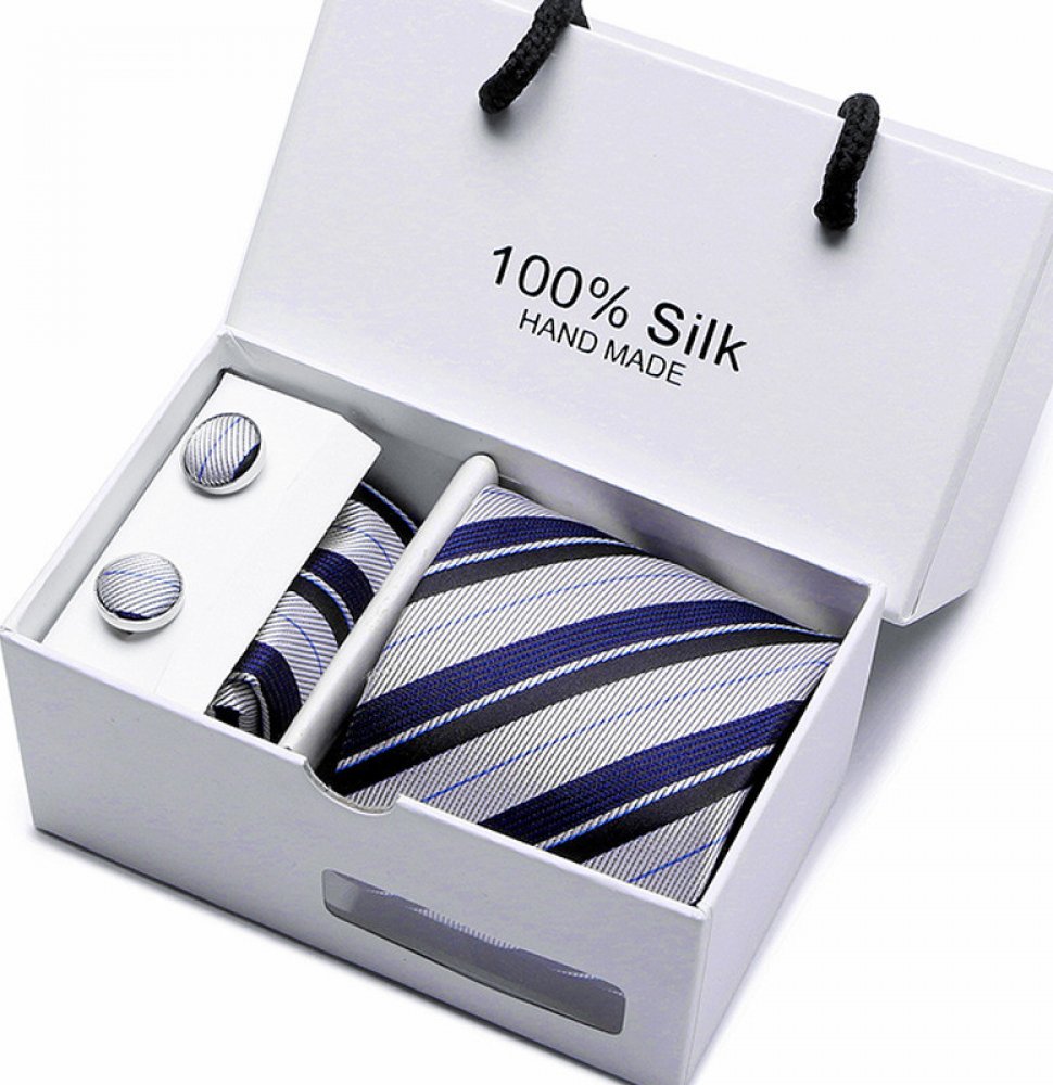 Elegantní pánská souprava obsahuje kravatu, kapesníček a manžetové knoflíčky, vše ve stejném barevném i materiálovém provedení. Kravata je velmi příjemná na dotek, dělá dobrý dojem. Manžetové knoflíčky se nosí ke košilím, které mají zesílené lemy rukávů.