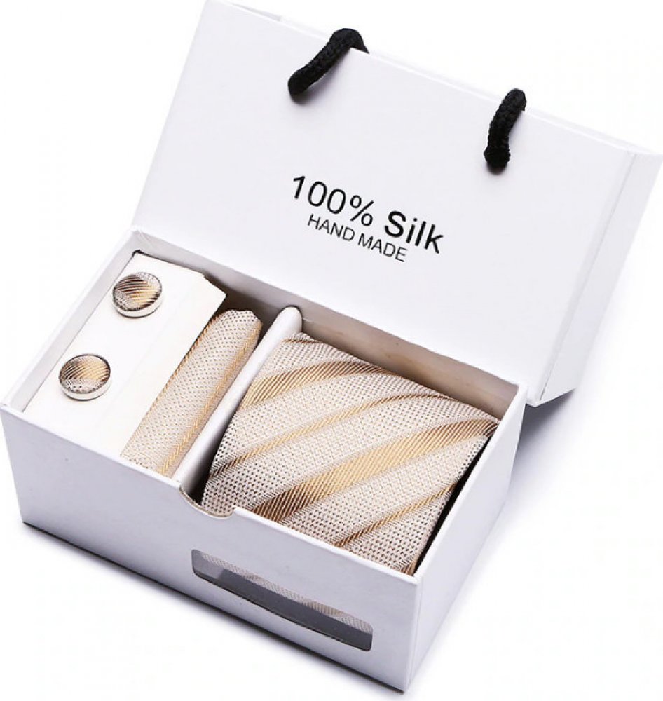 Elegantní pánská souprava obsahuje kravatu, kapesníček a manžetové knoflíčky, vše ve stejném barevném i materiálovém provedení. Kravata je velmi příjemná na dotek, dělá dobrý dojem. Manžetové knoflíčky se nosí ke košilím, které mají zesílené lemy rukávů.