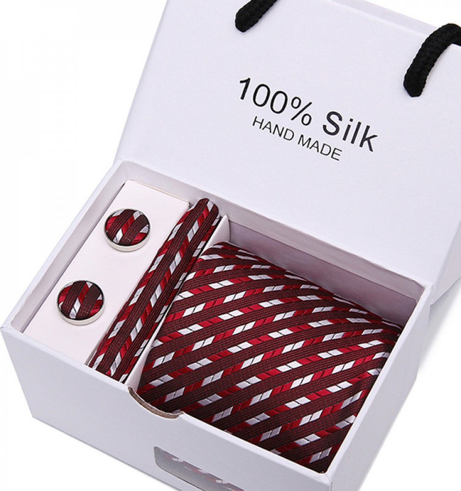 Elegantní pánská souprava obsahuje kravatu, kapesníček a manžetové knoflíčky, vše ve stejném barevném i materiálovém provedení. Kravata je velmi příjemná na dotek, dělá dobrý dojem. Manžetové knoflíčky se nosí ke košilím, které mají zesílené lemy rukávů.