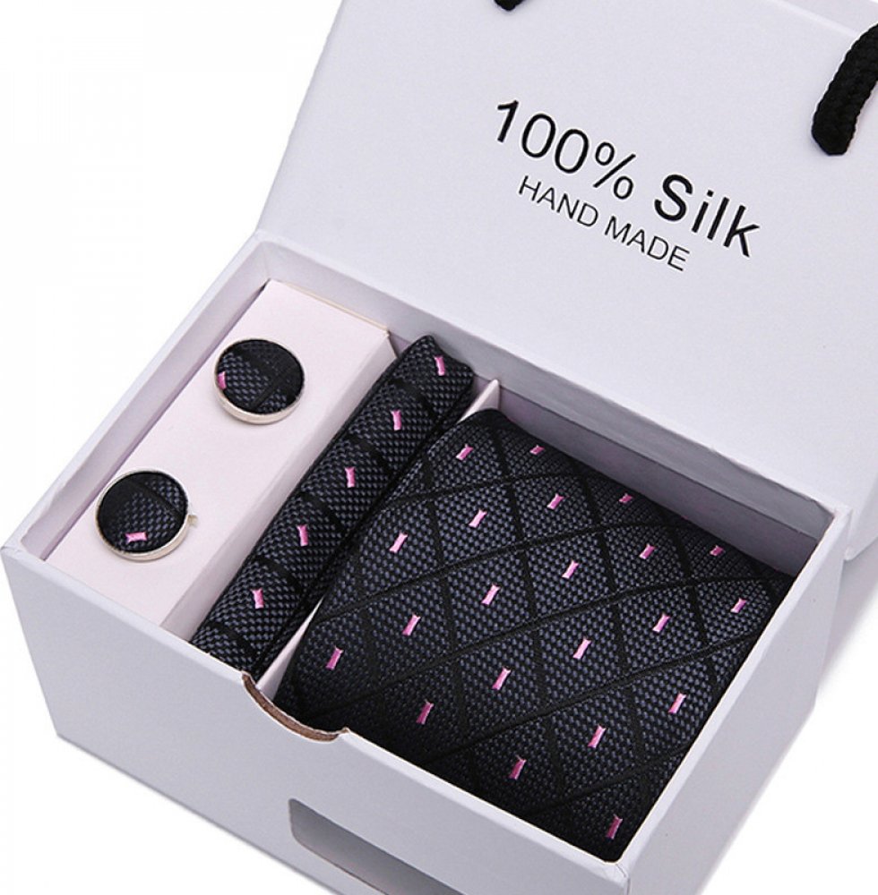 Elegantní pánská souprava obsahuje kravatu, kapesníček a manžetové knoflíčky, vše ve stejném barevném i materiálovém provedení. Kravata je velmi příjemná na dotek, dělá dobrý dojem. Manžetové knoflíčky se nosí ke košilím, které mají zesílené lemy rukávů.