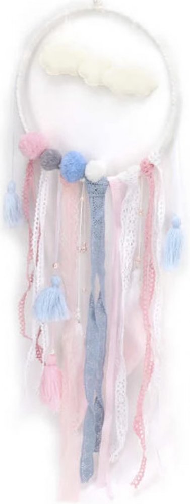 Ručně vyráběný lapač snů s obláčky, stužkami, peříčky a bambulkami, vhodný jako dekorace do dětského pokoje.