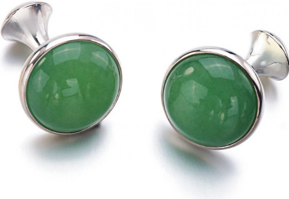 Manžetové knoflíčky s polodrahokamem malachyt ve stříbrném provedení. Manžetové knoflíčky se nosí pouze ke košilím, které mají zesílené lemy rukávů. Knoflíčky jsou vyrobeny z bižuterního kovu s lesklou povrchovou úpravou.