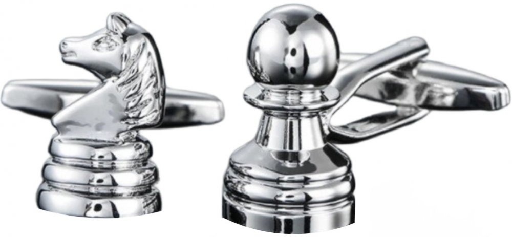 Manžetové knoflíčky ve tvaru šachových figurek, pěšce a koně. Manžetové knoflíčky se nosí pouze ke košilím, které mají zesílené lemy rukávů. Knoflíčky jsou vyrobeny z bižuterního kovu s lesklou povrchovou úpravou.