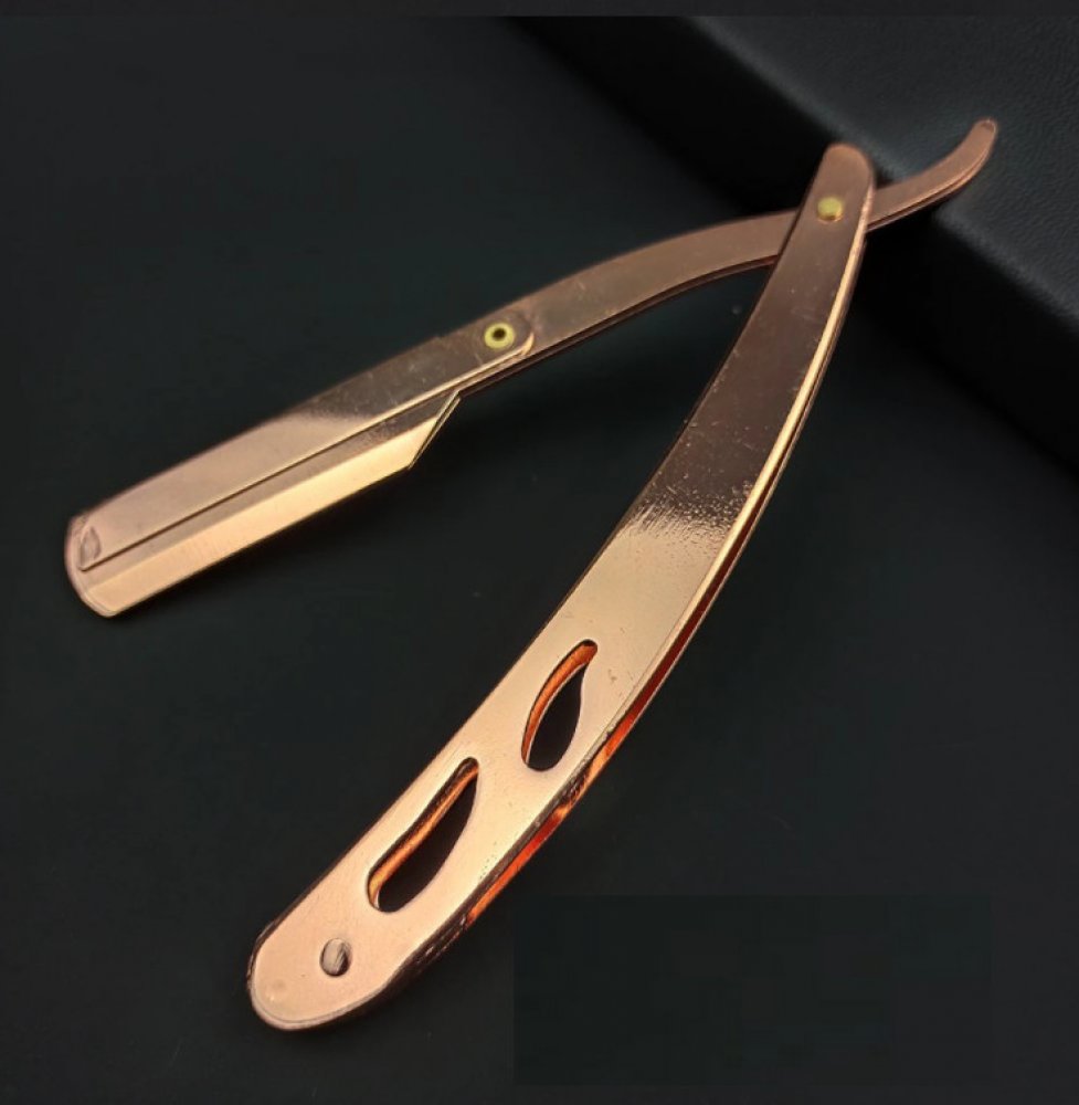 Nerezová zlacená shavetta na žiletky na holení nebo na seřezávání. Klasickou žiletku přehněte (nejlépe v papírovém obalu) po její délce a zlomte ji na půl. Vyrobíte tak pro shavettu dva kusy žiletek.