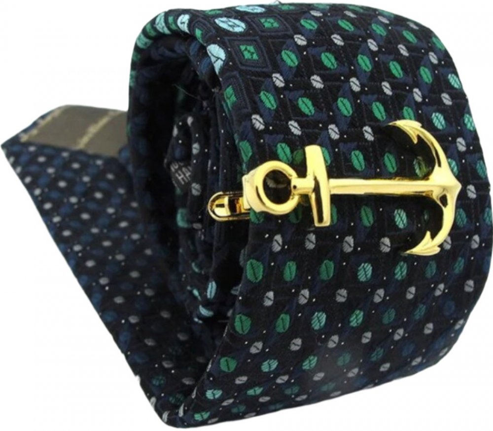 Spona na kravatu ve zlatém provedení s klipem pro snadné uchycení na kravatě. Spona je ozdobena kotvou. Kravata na obrázku není součástí spony.