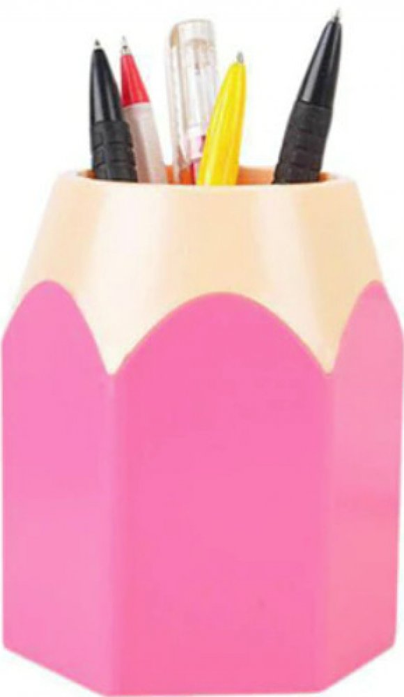 Plastový stojánek ve tvaru pastelky na pera, tužky, fixy, pastelky a štětce. Psací potřeby na obrázcích nejsou součástí stojanu.