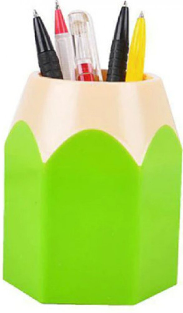 Plastový stojánek ve tvaru pastelky na pera, tužky, fixy, pastelky a štětce. Psací potřeby na obrázcích nejsou součástí stojanu.