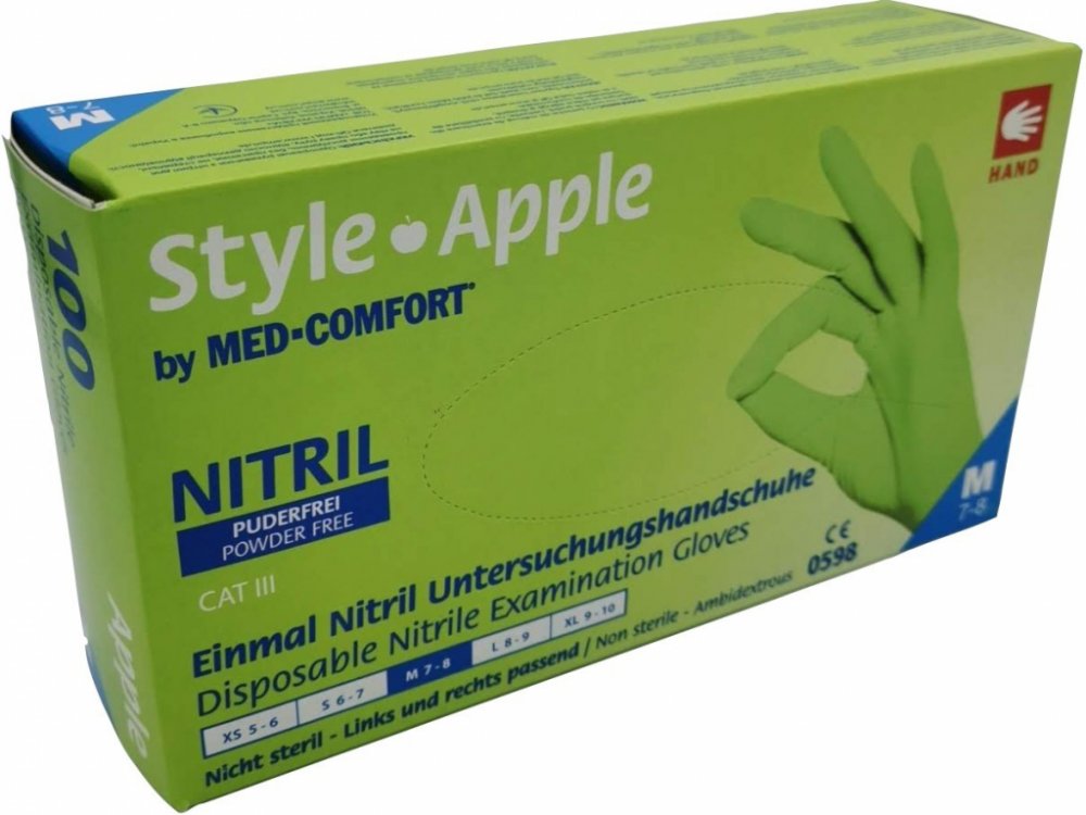 STYLE NITRIL COLOR jsou jednorázové nitrilové nepudrované rukavice, nesterilní, texturované na koncích prstů s rovnoměrně rolovaným okrajem. Nabízí uživateli vyšší mechanickou i chemickou odolnost, jsou hypo alergenní nezpůsobují alergické reakce na latex a pudr, mají atraktivní provedení v módních barvách. Díky nitrilové směsi lze jejich použití doporučit v průmyslu, protože dokonale chrání před tuky a oleji, dále ve zdravotnictví, kde slouží jako vyšetřovací rukavice s odpovídající ochranou. Vhodné pro styk s potravinami. AQL: 1,5. Normy EN 455, EN 420. Délka cca 240 mm. Velikosti M a L. Barva zelená. Balení 100 kusů. Cena uvedena za balení. Doporučené použití Potravinářský průmysl (např. vykosťování drůbeže, výroba sýrů, sběr ovoce, manipulace s mastnými potravinami, příprava a balení), automobilový a strojírenský průmysl (např. montáž malých olejnatých dílů), laboratoř (např. výroba léčiv, příprava léčiv, výzkum, analýza a manipulace s přesnými díly, kosmetický průmysl). Pokyny k použití Nasazují se na suché a čisté ruce. Manžetu umístěte přes oděv, abyste předešli proniknutí kapaliny. Rukavice jsou určeny pouze pro jednorázové použití. Při sundávání rukavic se nedotýkejte jejich vnější strany, přehněte konec manžety a stáhněte je otočením naruby. Pokyny ke skladování Rukavice skladujte v jejich originálním obalu, chráněné před přímým sluncem, v dostatečné vzdálenosti od zdrojů tepla.