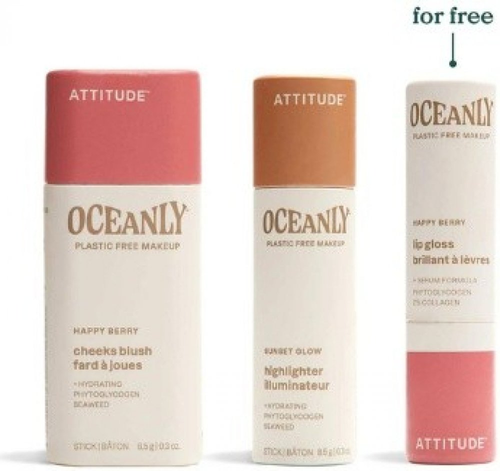 Make-up sada Oceanly je tu pro všechny, kdo chtějí mít přirozeně vypadající pleť a zářivý a svěží vzhled. Sada obsahuje tři tyčinky – tvářenku, rozjasňovač a lesk na rty – vyrobené z více než 94,5 % složek přírodního původu. Jsou přímo nabité účinnými látkami, včetně fytoglykogenu, o kterém je známo, že dodává pleti zářivost, snižuje známky stárnutí a poskytuje dlouhodobější hydrataci než kyselina hyaluronová. Výtažky z řas obnovují vláčnost a hebkost.