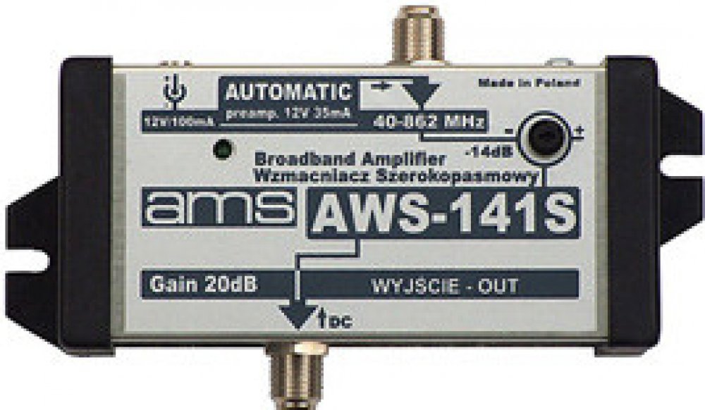 Širokopásmový zesilovač AWS-141S s jedním vstupem (40 - 860 MHz) a jedním výstupem pro domácí TV instalace. Zesílení 20 dB. Nastavitelné zesílení v rozsahu 14 dB. Zakončení na F konektory. Součástí balení je i napájecí zdroj. Zesilovač je vybaven automatickým spínačem, který může zapnout napájecí napětí 12V na vstupu a umožnit tak napájení předzesilovače v anténě.Tento zesilovač je také možné napá...