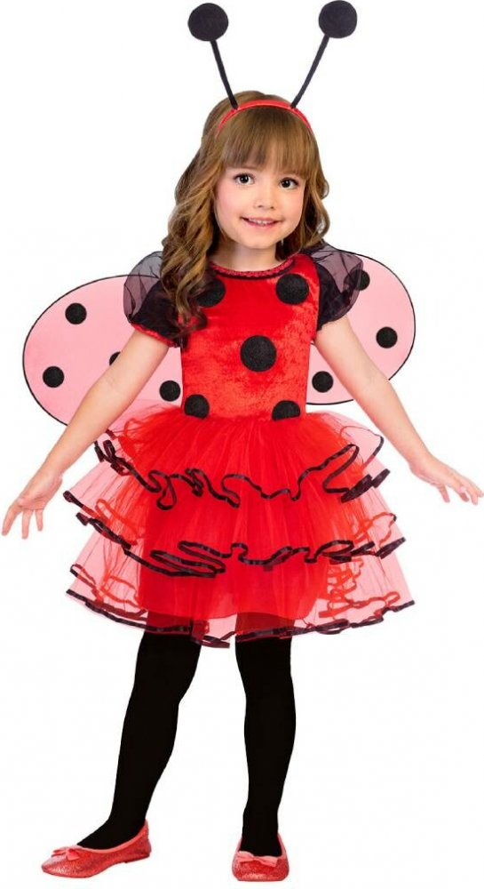 Dětský kostým Beruška v červeno-černé barvě, šaty tvořené velurovým topem a tylovou sukní doplňují odnímatelná křídla s puntíky a čelenka s černými tykadly, velikost 116-128 (6-8 let). Balení obsahuje šaty, křídla a čelenku (punčochy nejsou součástí balení).