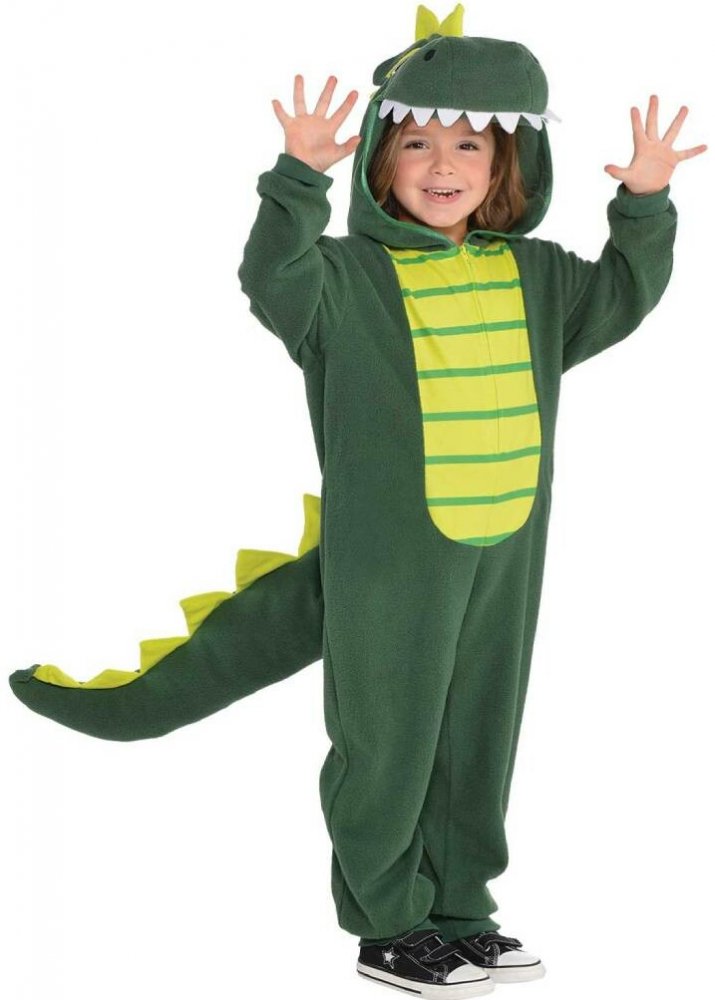 Dětský kostým Dinosaurus v zelené barvě, jednodílný overal má strečové manžety na zápěstích a kotnících, připevněnou kapuci ozdobenou bílými plstěnými zoubky, připevněný vycpaným ocas s hroty a na přední pruhované části zip, velikost 104-116 cm (4-6 let). Ošetření textilu: ruční praní ve studené vodě, sušení na šňůře.
