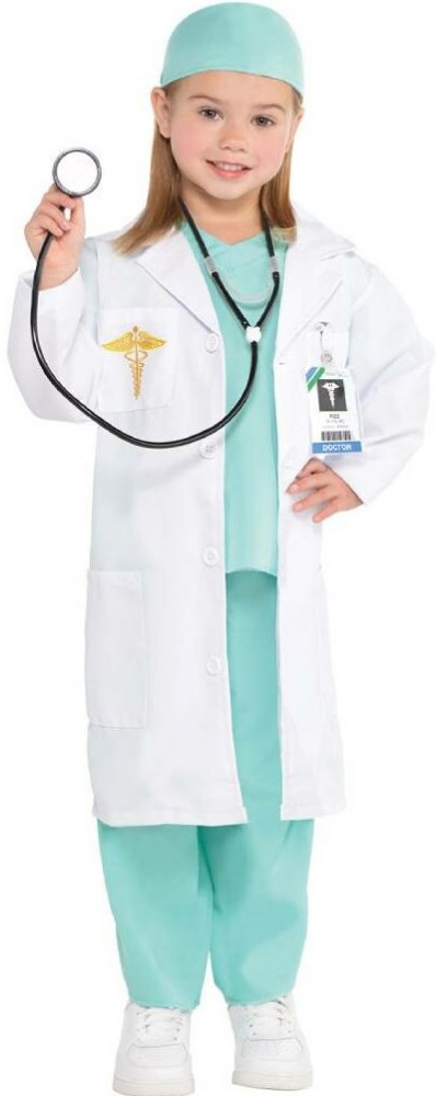 Dětský kostým Doktor / doktorka má vše jako opravdový lékař - zelenou pracovní košili a kalhoty, bílý laboratorní plášť se zlatou výšivkou, doktorskou čepici, stetoskop a identifikační visačku, velikost 116-128 (6-8 roky). Balení obsahuje plášť, čepici, košili, kalhoty, stetoskop a visačku.