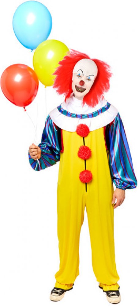 Pánský licenční kostým klaun Pennywise z hororu IT (To) ve žluté barvě s barevnými prvky, velikost XL (54). Balení obsahuje kombinézu s propracovanými detaily (3D pompomy, vrstvený límec, zip na přední straně) a latexovou maskou (čelo s obočím a červenou parukou).