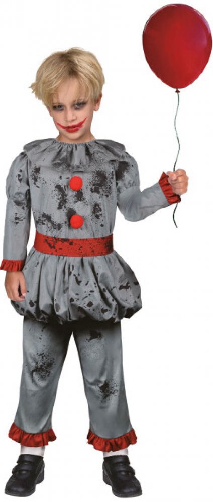Dětský kostým klaun Pennywise z hororu IT (To) v šedé barvě s červenými prvky, velikost 140-152 (10-12 let). Balení obsahuje top s propracovanými detaily (3D pompomy, límec, balonový spodek topu) a kalhoty.